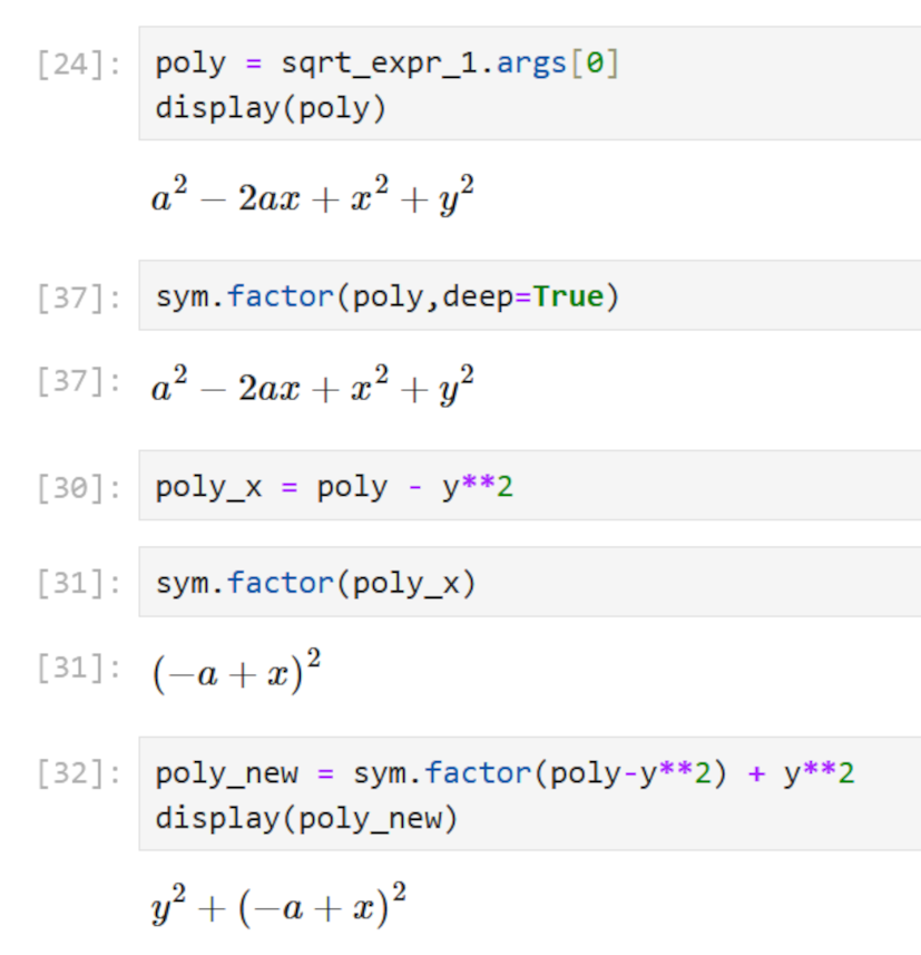 The Add branch is now a polynomial expression that we might be tempted to try SymPy’s factor on. However, Factor doesn’t know what to do with the portion involving $y^2$. However, if we isolate the portion of the expression involving just $x$ and $a$ by subtracting off the $y^2$ piece, factoring, and then adding $y^2$ back, we get a reasonable result. Both of these approaches are shone in the notebook snippet below: