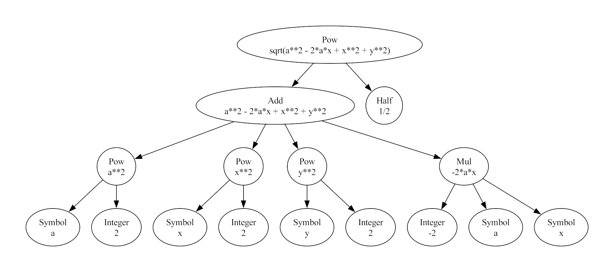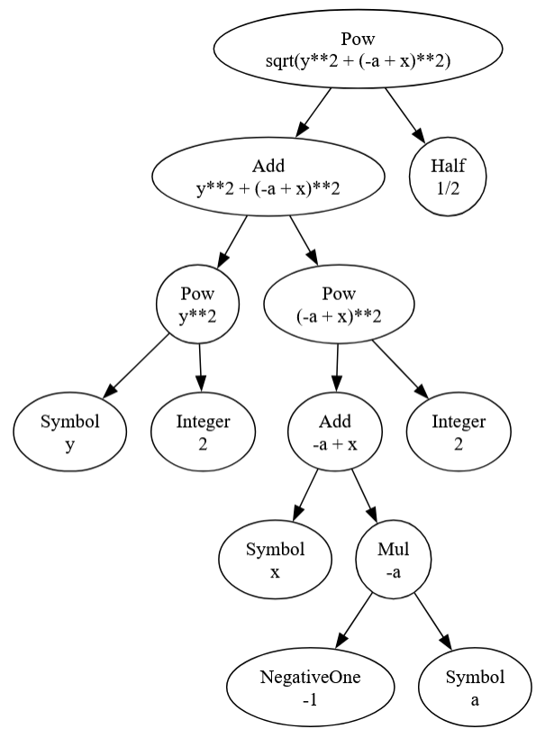 Every node in the a SymPy tree is either a function or a symbol. Functions own (almost always) children nodes reflecting their composite. Symbols are terminal nodes reflecting their atomic nature. At the top of the tree is the Pow function (for power) with two main branches: Add and Half. Add is the function that owns the four terms that algebraically add together while Half is a special symbol meaning 1/2. SymPy reserves a special symbol for this since division by 2 is so common. Of the four main branches of Add, three are Pow and one is Mul (for multiply). Like Add, Mul can own an arbitrary number of branches. In this case there are three, each terminating with the symbols $-2$, $a$, and $x$.