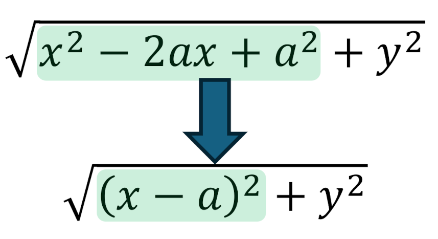 To understand this point better, consider that to represent the expression above requires nesting $x^2 – 2 a x + a^2 + y^2$ under a square root symbol. That’s four terms ‘owned’ by the square root, which we wish to ‘factor’ into two terms $(x-a)^2 + y^2$. In addition, each of these terms is complicated as none are ‘atomic’. A term is atomic if it consists of a symbol and nothing else.